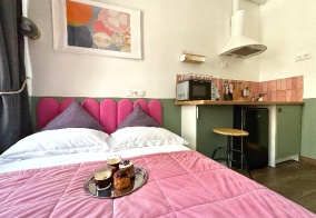 Интерьер апартаментов выполнен в современном стиле, уютный и продуманный до мелочей. В апартаментах есть все необходимое для комфортного проживания: удобная кровать, полностью оборудованная кухня, современная ванная комната и бесплатный Wi-Fi. Чистота и порядок поддерживаются на высоком уровне.