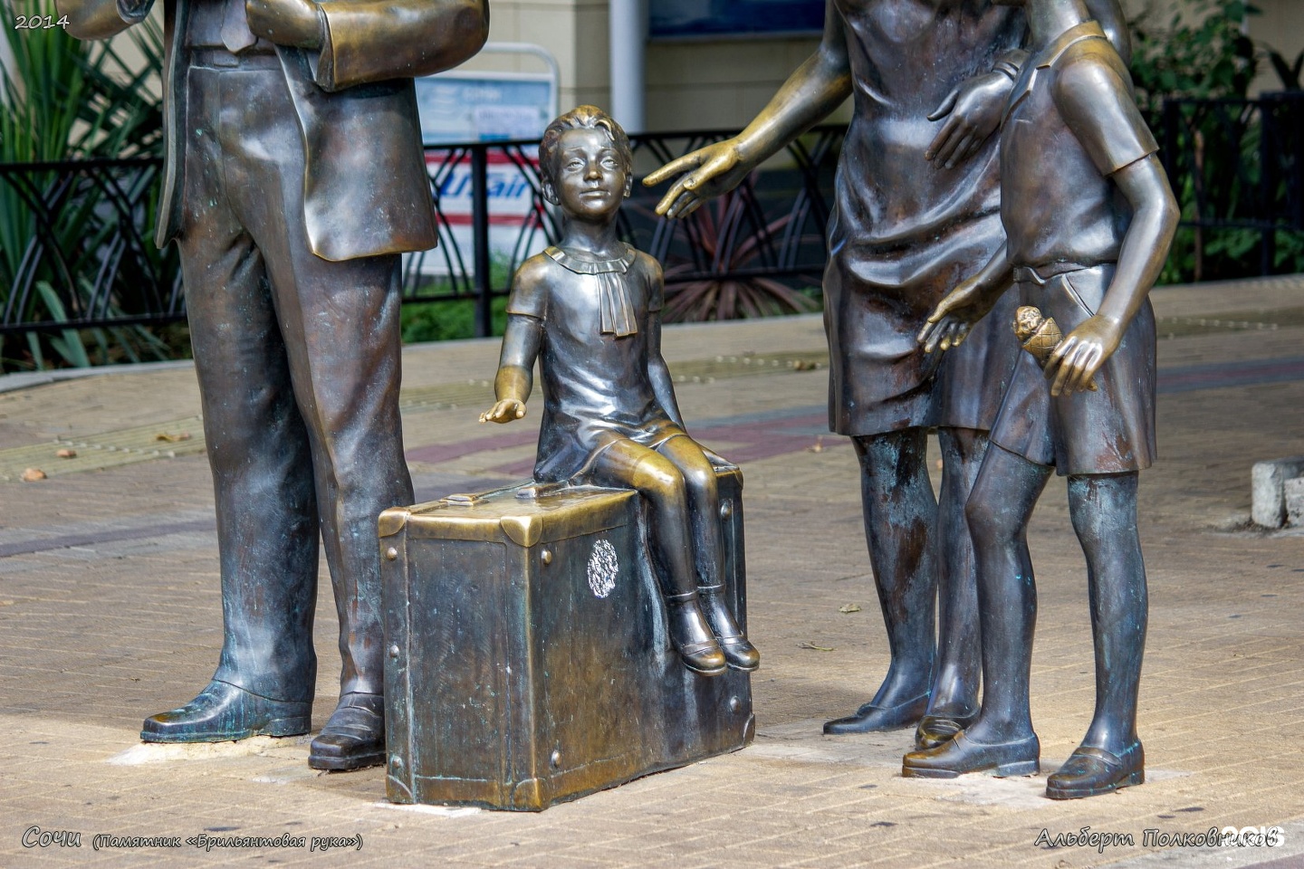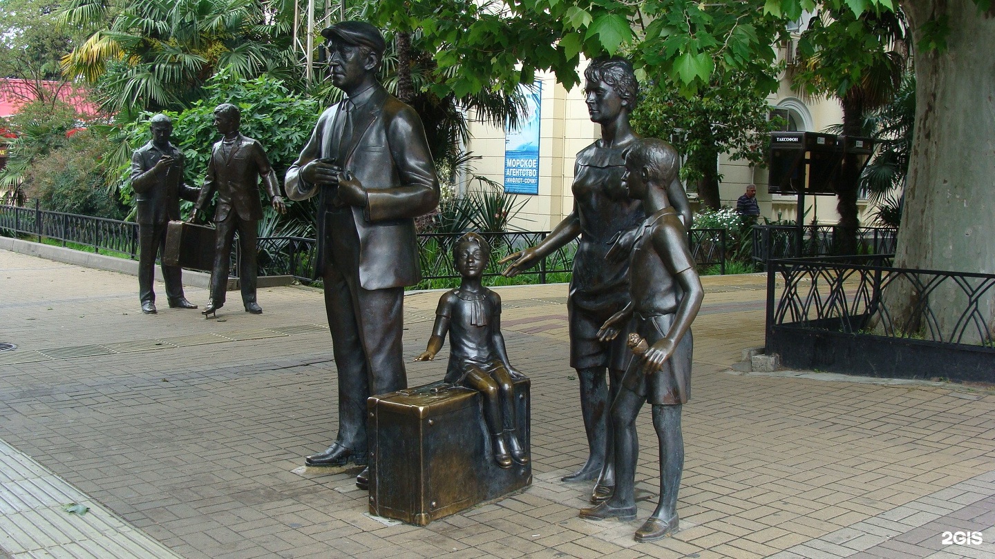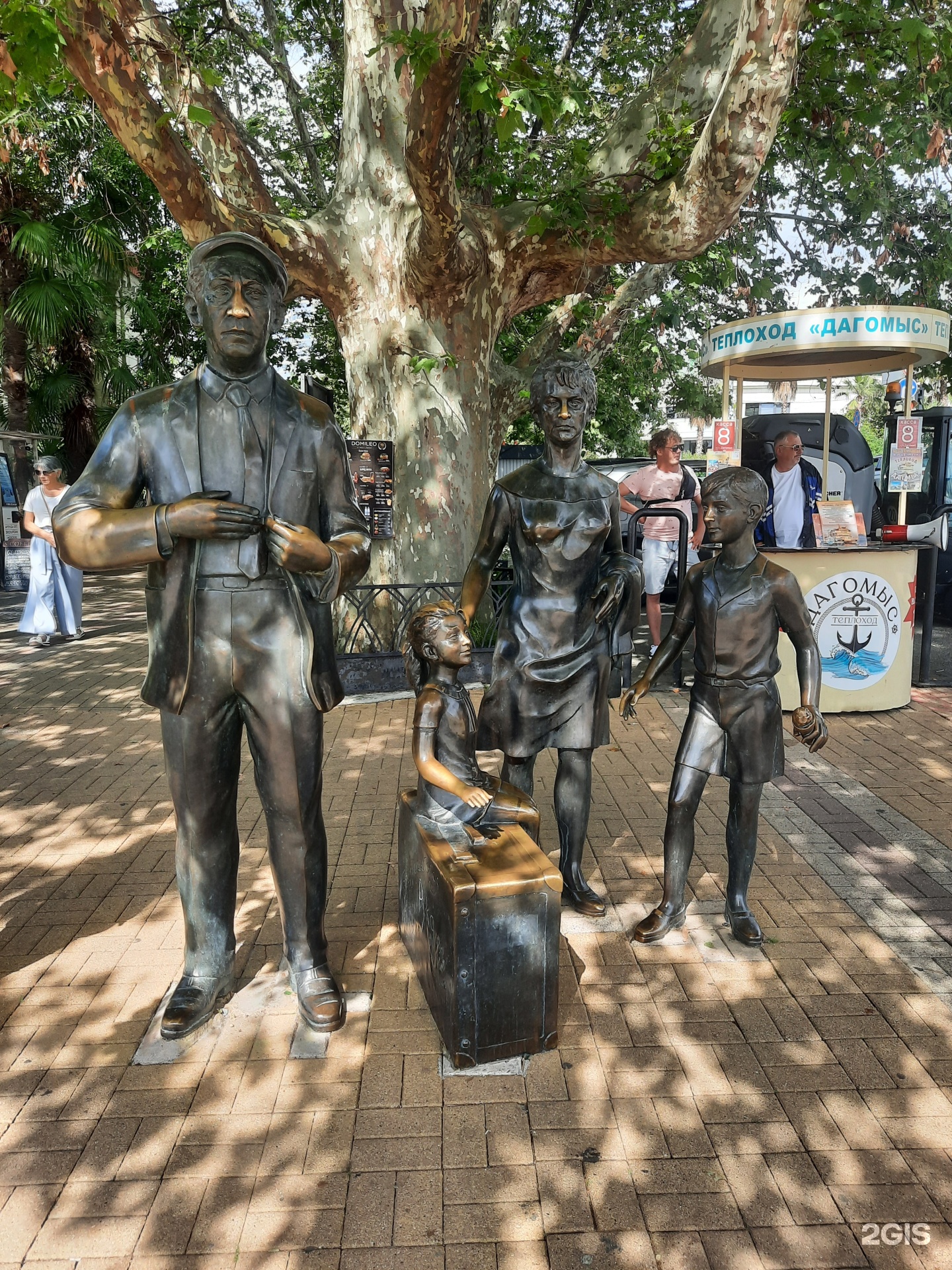 Фигуры отображают сцену из фильма "Бриллиантовая рука", где главный герой Семён Семёнович прощается с женой и детьми перед путешествием за границу на теплоходе "Михаил Светлов".
