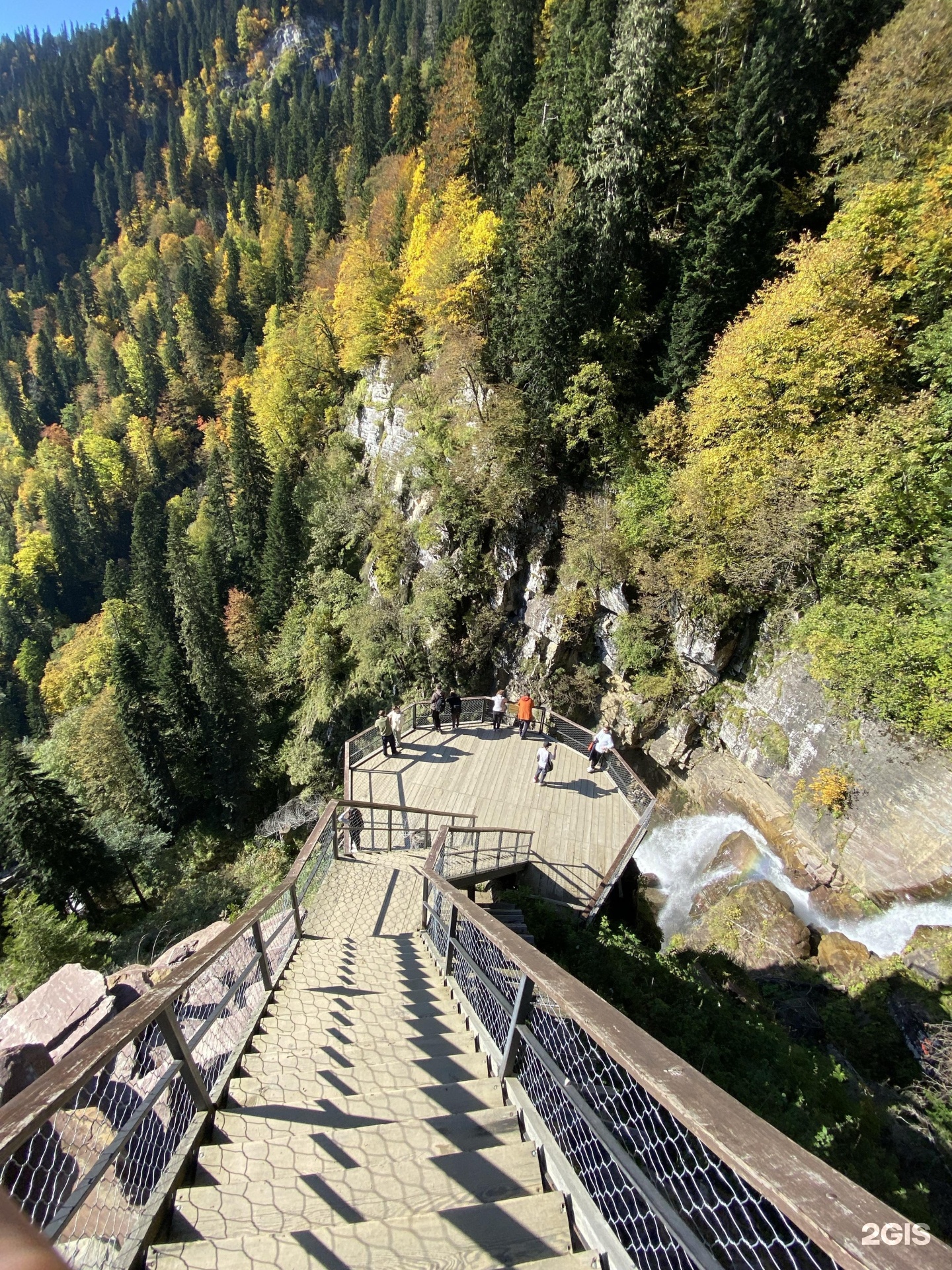 Парк водопадов Менделиха находится на южном склоне хребта Аибга на высоте 1470 м. Он получил свое имя от реки, в русле которой и расположены живописные каскады. Река Менделиха, которая здесь протекает, получила свое название от фамилии служившего во время Кавказских войн армейского фельдшера Бориса Менделя.