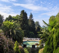 Санаторий построен ещё в советские времена в 1956 году. Относится к историческому памятнику архитектуры. Великолепные здания с резными колоннами и статуями. Огромный ботанический сад на территории санатория, бассейн с морской водой, фонтаны, зоны отдыха, лежаки, тениссный корт, биллиардный стол, свой бювет с минеральной водой. Величественные секвойи, пальмы невероятных размеров и различных видов, прекрасные магнолии, самшитовые кусты, банановые заросли, кипарисы, лавры и т. д. - глаза разбегаются от такого разнообразия!