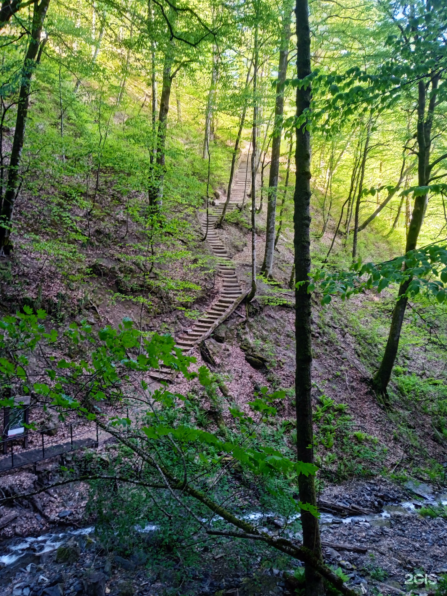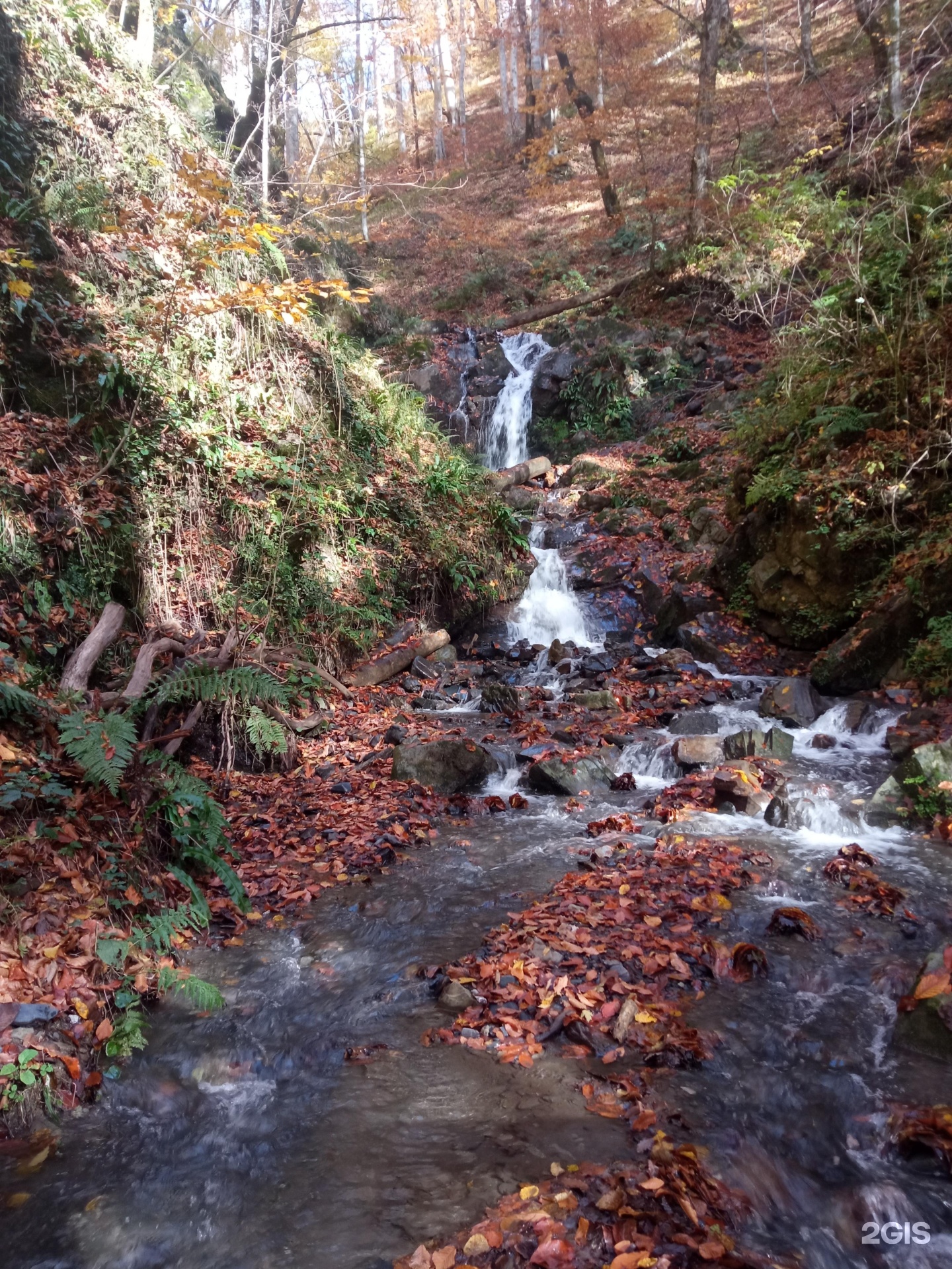 Небольшой водопад перетекающий в ручей. Расположен вблизи набережной. Рядом с ним имеются лавочки.