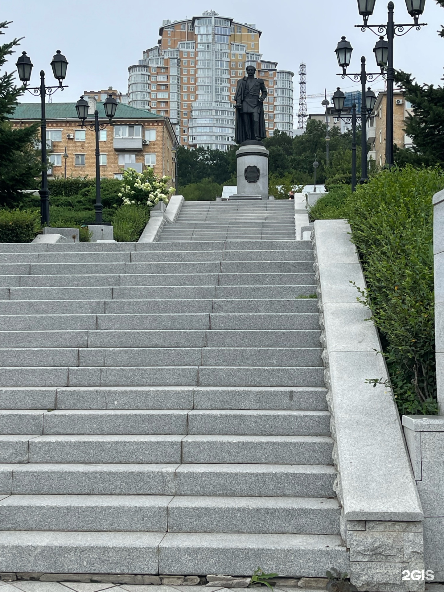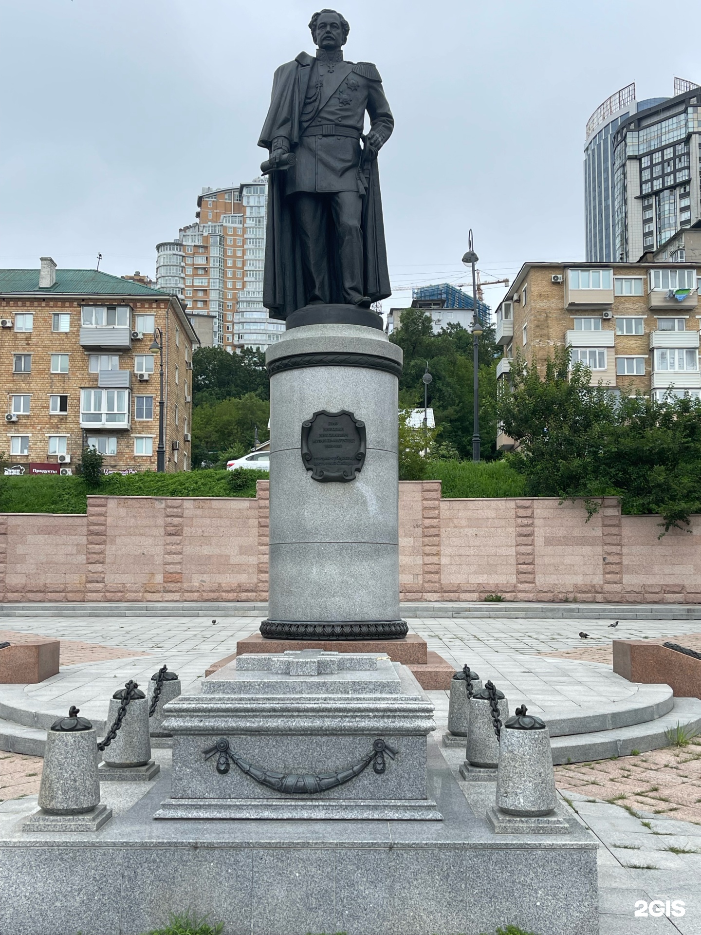 Муравьёв-Амурский Николай Николаевич, (11.08.1809-18.11.1881 гг.), граф, русский государственный деятель и дипломат, генерал от инфантерии (1858 г). Окончил Пажеский корпус (1827 г). Участвовал в русско-турецкой войне 1828-1829 гг. получив золотую шпагу с надписью "За отвагу", и польском походе в 1831 г. В 1845 г. получил чин генерал-майора и в следующем году назначен тульским губернатором. Отличался либеральным образом мыслей, сторонник освобождения крестьян. В 1847-1861 гг. енисейский губернатор, генерал-губернатор Восточной Сибири. Проводил активную деятельность по изучению и освоению края, привлекая к этому местную интеллигенцию, а также политических ссыльных; уделял внимание заселению края и расширению торговли на Дальнем Востоке. В 1854-1855 гг. руководил экспедициями по Амуру. Подписал со стороны России Айгунский договор 1858 г. После заключения договора о границе с Китаем получил титул графа Амурского. В 1859 г. на пароходо-корвете "Америка" Муравьёв-Амурский совершил плавание вдоль приморского побережья, в ходе которого получили свои названия залив Петра Великого, Амурский залив, Уссурийский залив, порт Владивосток. В 1861 г. уволен в отставку, назначен членом Государственного совета. Скончался в Париже в 1881 г. В декабре 1990 года прах Муравьёва-Амурского был перевезён во Владивосток и летом следующего года захоронен в сквере в центре города на пересечении улиц Суханова и Лазо.