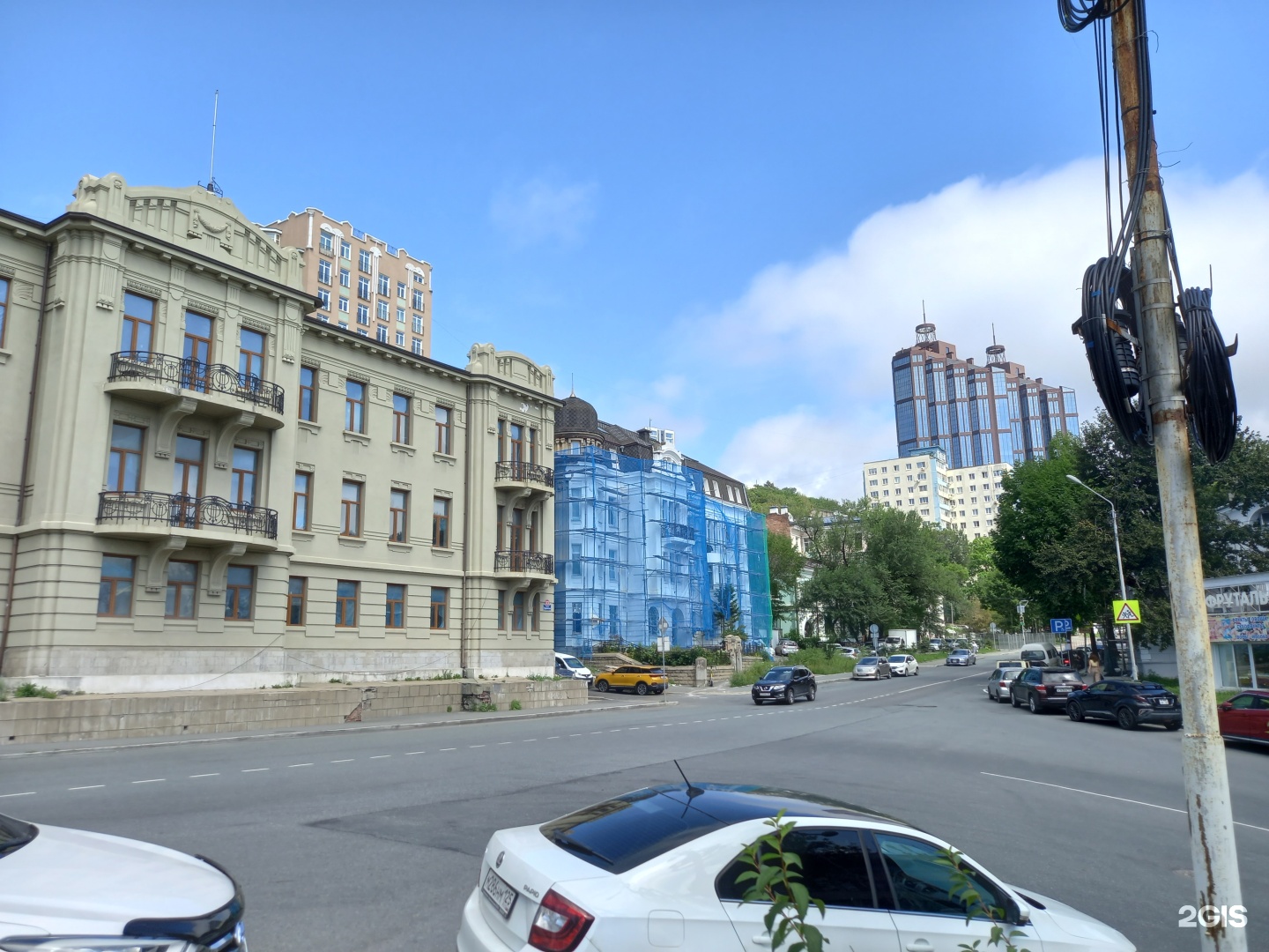 Жилой дом — историческое здание, построенное в 1947 году по проекту архитектора А.И. Порецкова. Это каменное двухэтажное сооружение асимметричной формы, вытянутое в глубину участка. Парадный фасад разделён на две части: левая оформлена в виде выступающего ризалита с трёхгранным эркером на втором этаже, а правая часть украшена глубокой террасой с металлическими решётками и декоративными вазами на пьедесталах. Стены здания покрыты декоративной штукатуркой и рустованы, а межоконные простенки на боковых фасадах декорированы скульптурными розетками. [1] В 1952–1965 годах в этом доме проживал Алексей Степанович Аллилуев — Герой Социалистического Труда, почётный гражданин и активный участник гражданской войны в Приморье.