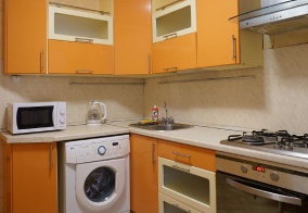 Есть все необходимое для проживания. В комнате находится двуспальная кровать с ортопедическим матрасом (ширина - 160 см), шкаф, прикроватные тумбы и ЖК-телевизор. В гостиной располагается двуспальный диван, ЖК-телевизор, шкаф. Кухня встроенная под единой столешницей, оборудована всей необходимой бытовой техникой (холодильник, микроволновая печь, электрический чайник,стиральная машина) и посудой для приготовления пищи. Ванная, туалет – кафель.Балкон застеклён (разрешено курение).