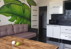 В самой квартире выполнен дизайнерский ремонт с продуманными до мелочей деталями интерьера. Просторная гостиная с системой освещения и мягкой мебелью, журнальным столом, телевизором с цифровыми каналами, а так же кондиционером. В кухонной зоне расположен гарнитур ( сенсорной варочной поверхностью, микроволновой печью, холодильником, и т.д.), наборами посуды, кухонным столом и стульями.