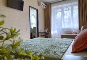 Хороший номер для одного, максимум для двоих человек. Чисто, большие окна, удобный матрас и ортопедические подушки. Окно выходит во двор, поэтому даже при приоткрытой створке шумно не было. Дом граничит с парком культуры, пройдя через который за 10 минут попадаешь на "Бродвей", как там называют проспект Кирова, место многочисленных тусовок и всевозможных заведений общепита. Проспект с одной стороны выводит к парку "Цветник,", с другой к ж\д вокзалу. Заселение дистанционное, что в общем-то удобно. В шкафу есть запасные комплекты постельного белья и полотенца. Замечания, конечно, тоже есть: банное полотенце, которым я начал пользоваться оказалось с дырочками, что немного испортило впечатление. Сковородка оказалась в разобранном виде, ручка, винтик, сама сковорода, все по отдельности. Пришлось восстанавливать. Ну и крышку для маленькой кастрюли хотелось бы по размеру, уж очень неудобно пользоваться крышкой в два раза больше кастрюли. Ну не бывает ничего идеального. В целом впечатление от номера хорошее.